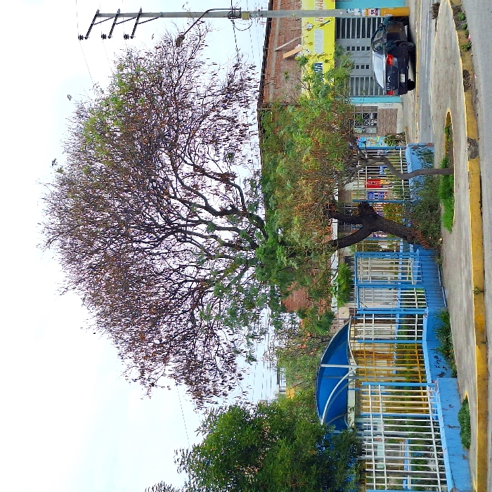 A large tree, partially bare, stands beside a sidewalk and a blue and white fenced-in area. Beyond the fence, more greenery is visible. A building with a yellow sign sits adjacent to a car parked on the sidewalk. A utility pole with wires runs parallel to the tree. The sky is overcast.