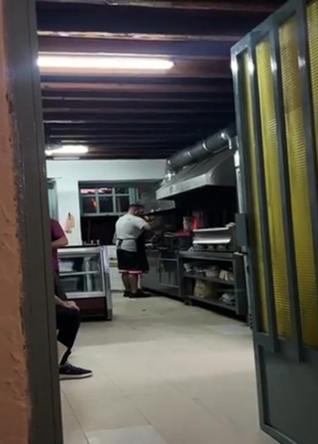 glimpse into a restaurant kitchen. A man wearing a white shirt and black apron is behind a stainless steel kitchen counter. The man is facing the cooking station and appears to be cooking or preparing food. The kitchen has a large stainless steel range hood over the cooking area. Several shelves and cabinets are beneath the counter, containing various kitchen supplies. In the foreground, there is an partially open door with a yellow paneled glass. Two people are seen sitting at a table just outside the kitchen. The walls are painted in light colors, and the ceiling has exposed dark wooden beams. A fluorescent light is attached to the ceiling.