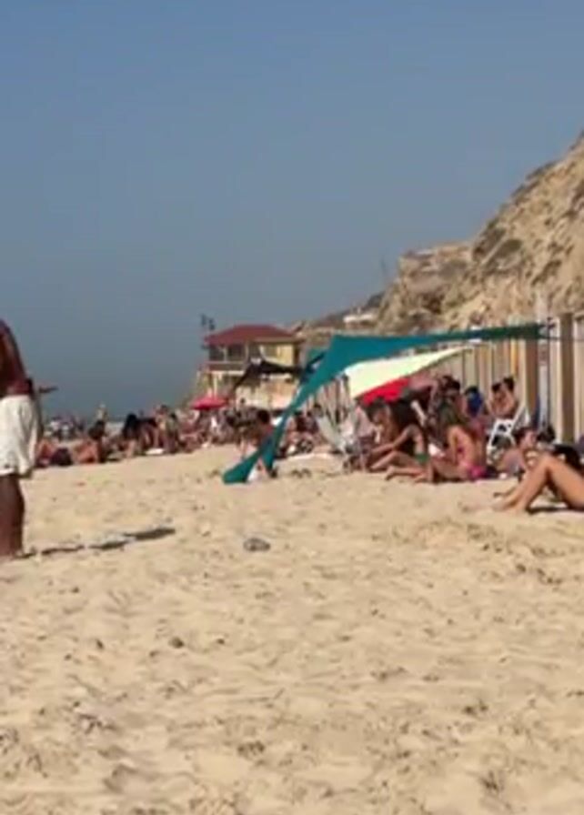 The video depicts a crowded beach on a sunny day. People are sunbathing on the sand, some under sunshades or tents. A building is visible behind the beach, near a cliff face. One man in white shorts walks in the foreground.