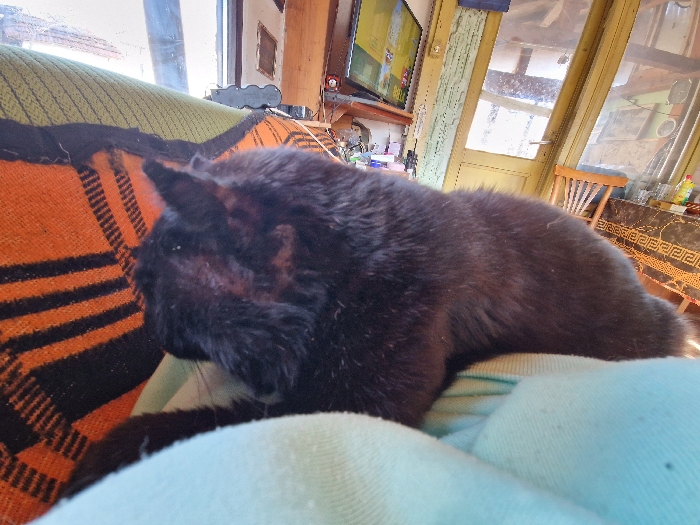 An indoor scene in Raduvene, Bulgaria, depicts a black cat resting on a person's lap, covered by a light blue fabric, and an orange blanket with black stripes