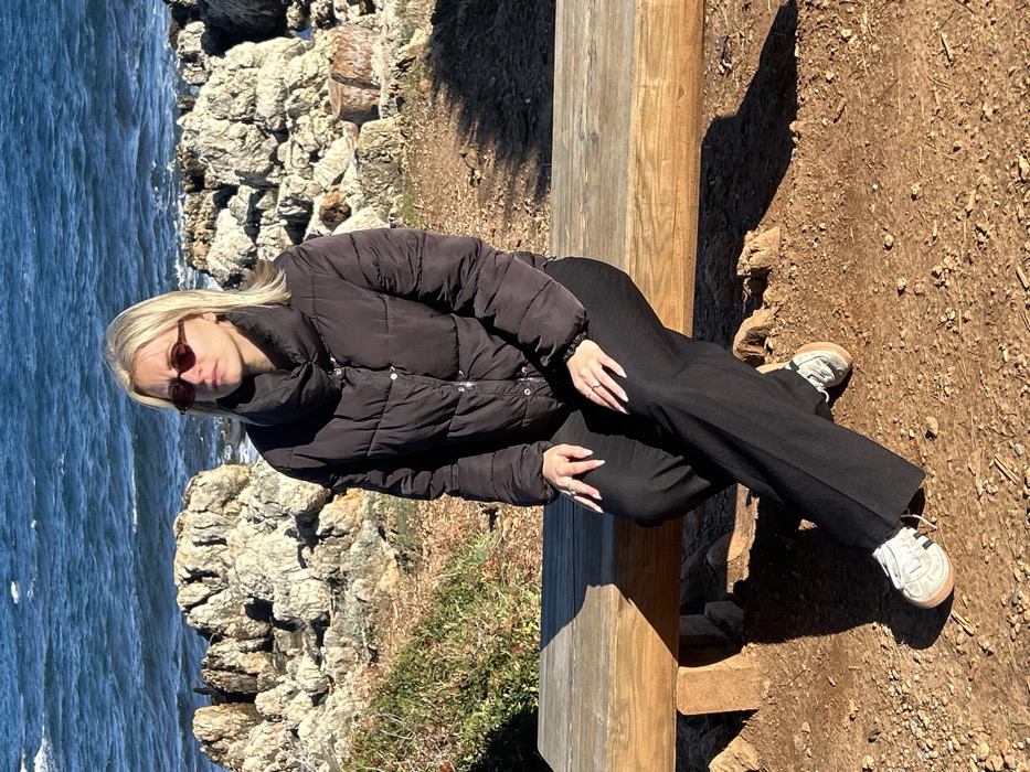 A young adult female with blonde hair and dark red oval sunglasses is seated outdoors on a light brown wooden bench. She wears a dark brown puffer jacket, black wide-leg trousers, and light-colored sneakers with dark stripes. Her hands rest in her lap, displaying light-colored manicured nails and rings on both index and ring fingers. She is situated on reddish-brown earth with scattered small stones, with her gaze directed forward. In the background, a clear blue sea with visible waves stretches behind rugged, light-colored rocky outcrops and sparse green vegetation. The scene is illuminated by strong sunlight, casting distinct shadows on the ground and bench. This location is identified as the city of Antibes, France.