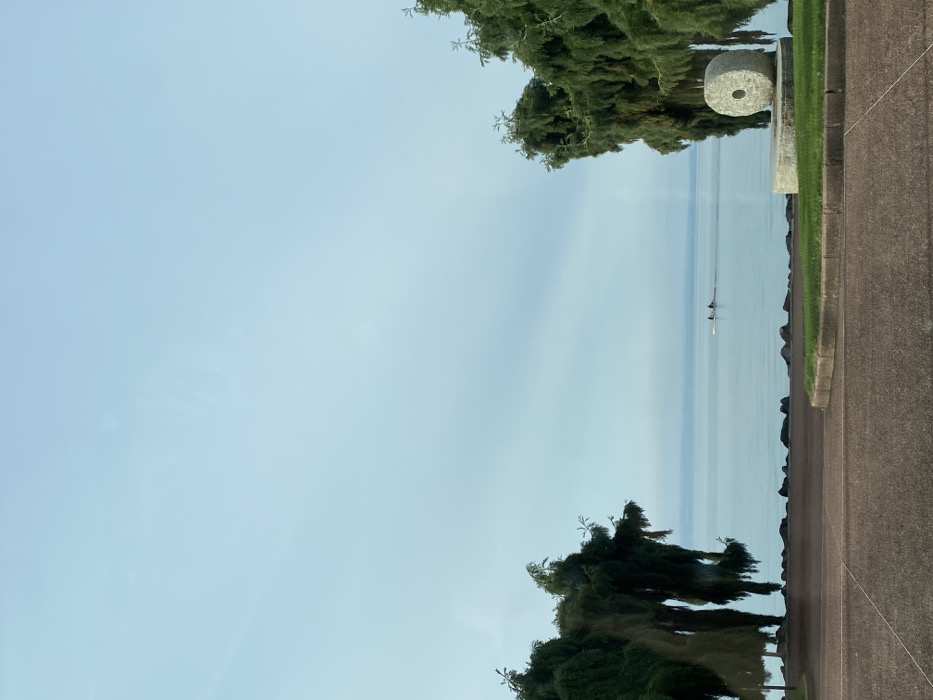 The image depicts a tranquil waterfront scene in Évian-les-Bains, France, likely along the shore of Lake Geneva (Lac Léman). The upper two-thirds of the frame are dominated by a pale blue-grey, overcast sky, meeting a calm, light blue body of water at a distant, hazy horizon. In the middle distance on the lake, a slender, light-colored boat, possibly a canoe or rowing shell, is propelled from left to right by two individuals seated within it. The immediate shoreline consists of dark, irregular rocks. Framing the view of the lake are dark green coniferous trees with drooping, weeping branches, visible on both the far left and right sides of the image. In the lower foreground, a reddish-brown paved area, possibly a path or road, is present. A dark grey curb separates this paving from a strip of neatly maintained green grass. Positioned on this grassy strip, beneath the right-side trees, is a stone monument consisting of a circular, thick disc with a central hole, set upon a rectangular stone base.