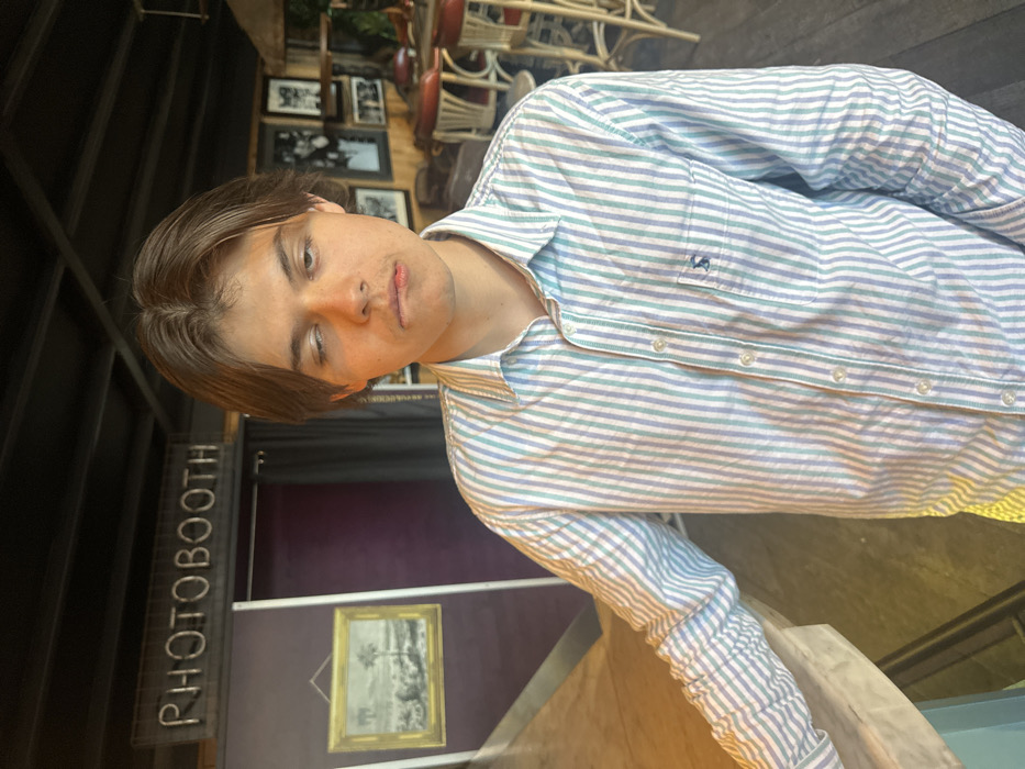 A young man, wearing a blue and white striped long-sleeved shirt with a small embroidered 'S' on the left breast pocket, stands with his right hand resting on a wooden counter