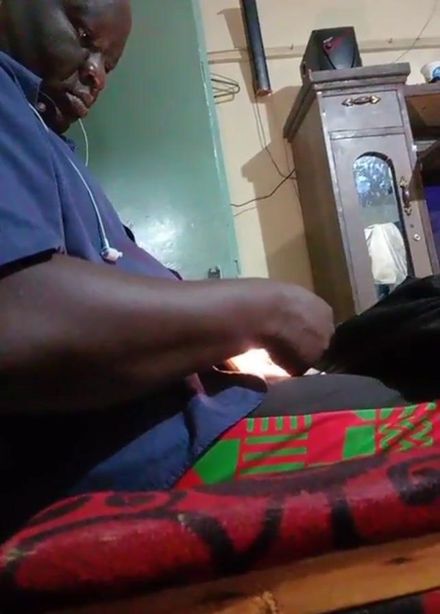 A dark-skinned person wearing a blue shirt and white earbuds is sitting on what appears to be a red and green patterned cushion. They are looking down, manipulating an object in their hands. The background shows a pale green door, a dark grey cabinet with a mirrored door, and a dark object hanging on the wall. The room seems dimly lit.