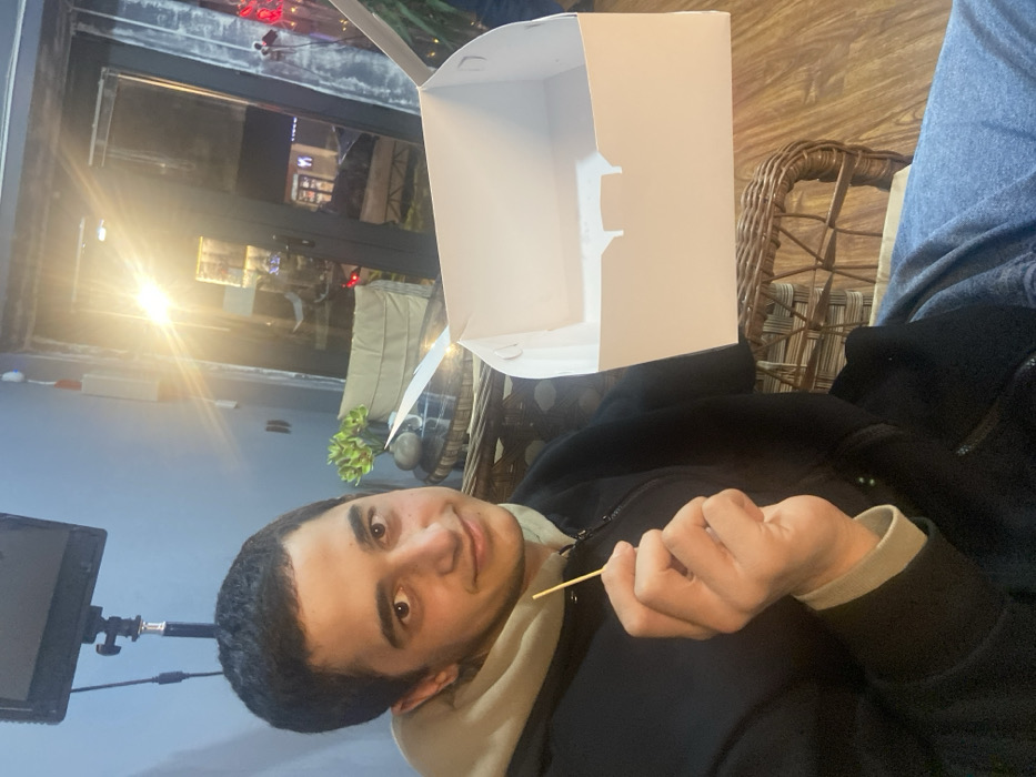 An interior photograph depicts a young adult male, seated in what appears to be a commercial establishment, located in Gori, Georgia. The precise street address or venue within Gori is not identifiable from the visible elements. The male, with dark hair and eyes, wears a black zippered jacket over a light-colored hooded garment and blue denim jeans. He looks directly at the camera with a slight smile. His right hand holds a thin, light-colored stick, consistent with a toothpick or small skewer, positioned between his thumb and forefinger. His left hand presents an open, empty white cardboard box, typically used for pastries or baked goods, with its lid folded back to reveal the interior. The immediate background on the left features a blue-grey wall, against which a black light stand supporting a rectangular panel light is positioned. To the right of the subject, a small, round table with a dark, possibly glass, top and a wicker base holds a decorative arrangement of artificial green plants. A light-colored upholstered chair is partially visible behind the table. Behind these objects, a large glass door or window reflects an outdoor nighttime street scene. This reflection displays bright streetlights, one exhibiting a prominent starburst flare, outlines of distant buildings, and what appears to be vehicle lights. A faint red glowing object, possibly a neon sign or decoration, is visible through the glass on the far right. The interior flooring is composed of wood laminate.
