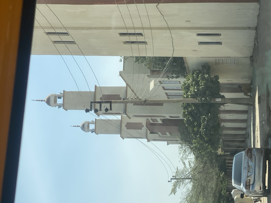 The image depicts a street scene in Kabuga, Nigeria, under a clear, bright blue sky, viewed from within a vehicle. In the background, a light-colored mosque with two prominent minarets dominates the left-center, featuring decorative domed tops with pointed finials and open upper sections. The minarets and main mosque structure have cream or beige facades with vertical brown or maroon accents. To the immediate right, a multi-story building, also cream-colored with brown accents, stands prominently, displaying multiple rectangular windows on its facade. In the mid-ground, a black utility pole with several horizontal insulators and multiple overhead power lines crosses the frame, partially obscuring the mosque and extending towards the right. A large, dense green tree grows near the base of this pole, casting some shadow. To its right, an individual in dark clothing is seated on the ground, leaning against the cream-colored building. On the left side of the asphalt or dirt road in the foreground, a silver four-door sedan, resembling a Toyota Corolla, is parked, facing away from the viewer. Behind and to the left of the car, two individuals wearing light-colored traditional garments are walking on what appears to be a sidewalk or dirt shoulder. Sparse, arid-looking vegetation is visible in the distance on the far left. The overall scene is brightly illuminated by direct sunlight.