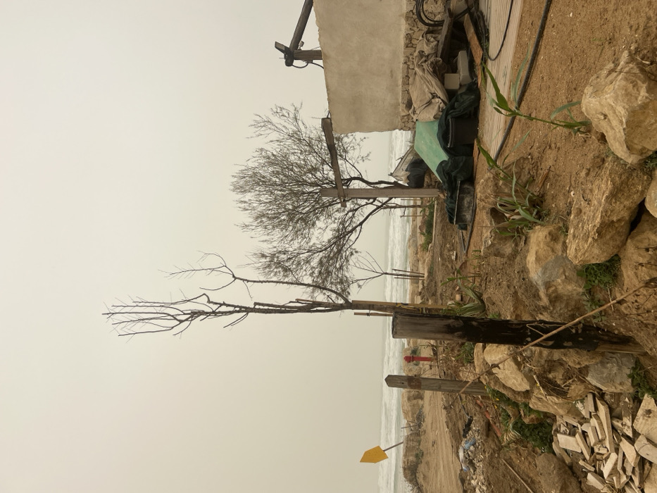 The image captures a coastal landscape in Jisr az-Zarqa, Israel, under a uniformly pale, hazy sky. The foreground features uneven, sandy-brown earth interspersed with numerous light-colored rocks and sparse green ground vegetation, including several small aloe vera plants. Two weathered, dark wooden posts stand vertically in the left-center foreground; the taller post shows significant dark staining or charring. To the immediate left of these posts, a pile of fractured white ceramic or stone debris is visible. In the mid-ground, a red fire hydrant is positioned behind the wooden posts. Further back, a rough beachfront composed of sand and rocks slopes towards a moderately turbulent sea, characterized by white breaking waves. A yellow, triangular marker on a pole is situated near the water's edge on the left. The central mid-ground is occupied by three prominent trees: two tall, slender, bare-branched trees, possibly recently pruned or dead, stand adjacent to a shorter, bushier tree with dense, small leaves. Several smaller saplings with support stakes are also planted. To the right, a partially constructed or dilapidated concrete structure with a textured, light-colored wall is present. Adjacent to and behind this structure is an accumulation of miscellaneous items, including a large green tarp, other bundled fabric or canvas materials, black plastic buckets and containers, a metal tray, coiled black hoses or cables, and scattered wooden planks. A rudimentary wooden framework, consisting of a horizontal beam supported by a vertical post, extends from the concrete structure. Another dark wooden beam, possibly a winch component or antenna, protrudes upwards from behind the building. The background consists solely of the hazy sea meeting the featureless, light-beige sky. No individuals are present in the scene.
