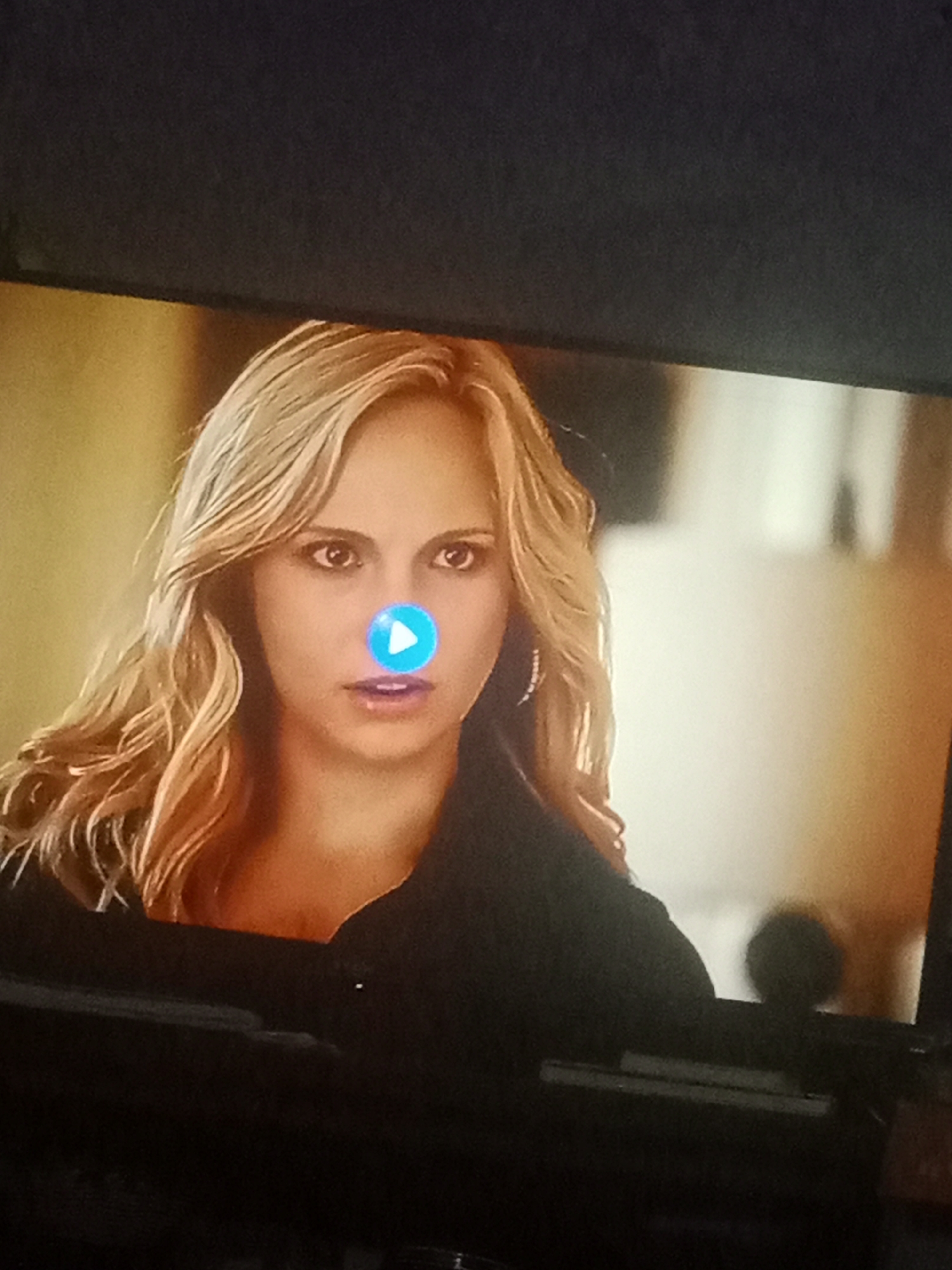 A medium shot displays a blonde woman with a focused expression, appearing to be in a scene from a video. The subject is wearing a dark-colored garment, possibly a jacket or shirt. A bright blue play button overlay is superimposed on her face, near her lips. The background is blurry, suggesting an indoor setting with warm-toned walls and indistinct objects. The image seems to be a photograph of a TV or monitor screen. The city and location of Tinaquillo, Venezuela, are not apparent from the content of this image.