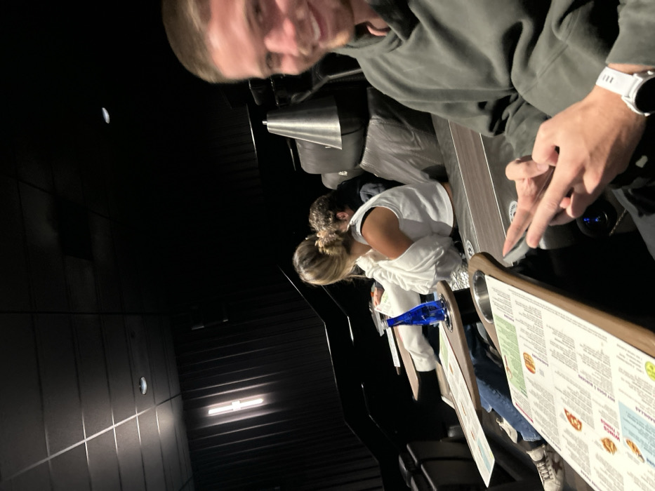 The image depicts the interior of a luxury movie theater in Miami, United States, characterized by dim ambient lighting. The scene is illuminated by overhead recessed lights, vertical wall sconces, and light emitting from a smartphone. Three individuals are visible within the cinema's dark, acoustically treated environment. In the foreground, positioned to the right, a male subject with short hair and wearing a dark hooded sweatshirt is visible from the chest up. He smiles towards the camera while actively operating a smartphone with both hands. A white smartwatch is visible on his left wrist. In the mid-ground, to the left, a female subject with blonde hair tied in a bun is seated with her back partially to the camera. She wears a white top and appears to be observing a menu placed on a dark wood-finish swing-out table. A blue glass bottle rests in a cup holder on her table. A third, less distinct individual is seated behind the female, visible in profile. The seating consists of plush, dark-colored recliner-style seats, each equipped with an individual swing-out table and a cup holder. Multiple paper menus, detailing food and beverage options, are displayed open on the tables, indicative of an in-seat dining service. The cinema features ascending rows of seats and dark walls.