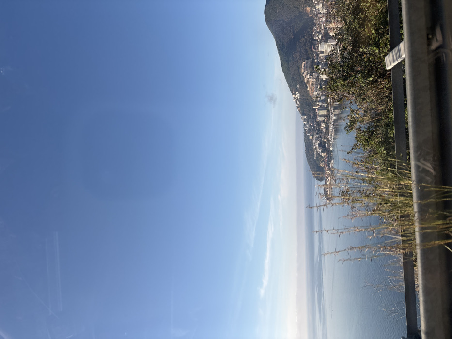 The image presents an elevated coastal panorama of Košljun, Montenegro, under a clear, bright blue sky with minimal atmospheric haze on the distant horizon. Approximately two-thirds of the upper frame is clear sky, showing faint linear and circular reflections consistent with a view through a window. Below the sky, a calm, blue-grey body of water extends from the mid-ground to the horizon. Small, dark, indistinct objects, possibly boats, are visible on the water's surface in the middle left. On the right, a verdant, tree-covered mountain slopes towards the sea. The lower and mid-slopes of this mountain are densely populated with numerous light-colored, multi-story buildings, characteristic of a coastal city or large town. A prominent marina or harbor, filled with multiple small vessels, is situated in a cove at the base of the mountain, centrally located in the mid-ground. A large, terraced building is visible further up the mountain slope, and a slender vertical structure, possibly an antenna, crowns the mountain peak. The foreground is occupied by a horizontal, silver-grey metal guardrail, indicating an elevated viewpoint, likely from a road. In front of the guardrail, clusters of tall, dry, light-colored grasses and some dark green foliage are present, partially obscuring the lower portion of the coastal scene. No individuals are visible within the depicted environment. No actions or interactions are discernible.