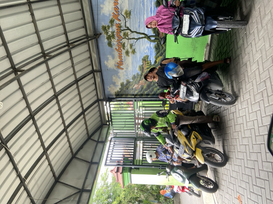 Under a corrugated metal roof, people on motorbikes line up against a wall painted with a landscape mural. A woman in a pink headscarf sits on a blue motorbike at the end of the line. Further down, a man with a blue helmet is on a dark motorbike. Another person wears a green helmet and a green 'GoJek' jacket on a yellow motorbike. Another motorbike is further down and is green.