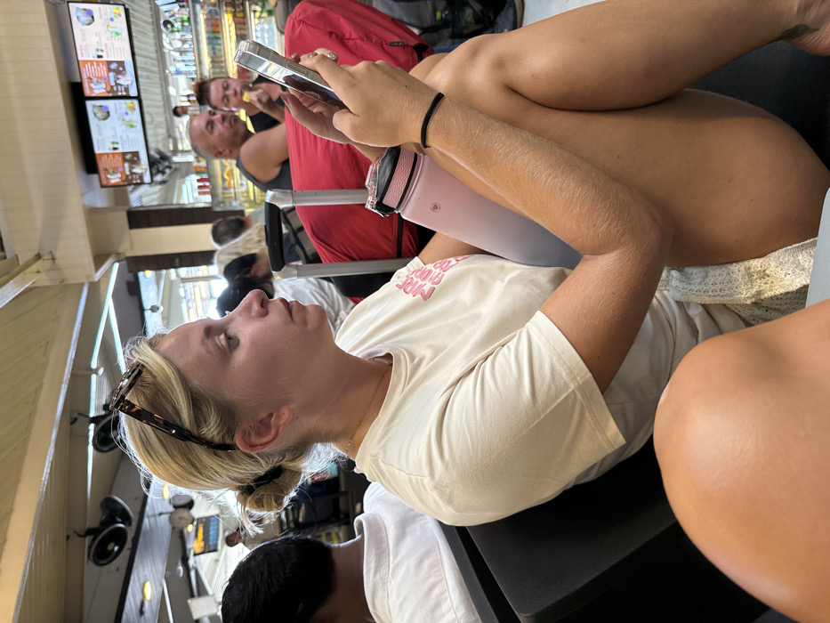 A woman is seated, engrossed in her phone. She wears a light-colored t-shirt and has blonde hair pulled back in a bun. Sunglasses rest atop her head. A pink water bottle is positioned near her side. In the background, a man with a shaved head looks towards her, while another person is seated beyond him, also looking at a phone. Menu boards are visible in the upper background.