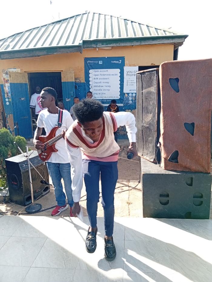 An outdoor scene in Jebbu Miango, Nigeria, depicts two young adult males performing or preparing to perform in front of a single-story building. The male in the foreground, center-right, is leaning forward, holding a black microphone in his right hand. He wears a cream-colored sweater with horizontal red and pink stripes over a white long-sleeved shirt, dark blue slim-fit trousers, and black patterned loafers. To his left and slightly behind, a second male stands, holding a red bass guitar with a white pickguard. He wears a white short-sleeved t-shirt, blue jeans, and red athletic shoes. Musical equipment includes a large black speaker cabinet on a stand to the left, a microphone stand positioned behind it, and another large black speaker cabinet on the ground to the right, topped with a brown, possibly padded, object featuring irregular cutouts. Cables are visible on the ground connecting the equipment. The building behind them features light brown/ochre walls with blue trim around an open doorway on the left. Through this doorway, several individuals are partially visible, observing the scene. A corrugated metal roof covers the structure. A blue banner is affixed to the building's facade, displaying "First Bank" and "Firstmonie" logos and listing services such as "Open account," "Open Firstmonie wallet," "BVN enrolment," "Deposit money," "Withdraw money," "Transfer money," and "Buy airtime." The immediate foreground features a light-colored tiled surface, casting strong shadows from the bright sunlight originating from the upper right. Beyond the tiled area, the ground appears to be dirt or gravel. A small green shrub is visible on the far left.