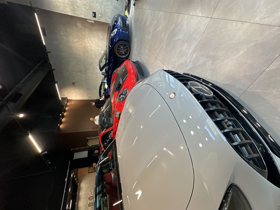This image depicts an interior view of a luxury automobile showroom located in Tel Aviv, Israel. The scene features multiple high-performance sports cars displayed on a reflective light grey tiled floor, under a black ceiling with exposed ductwork and modern track lighting and linear LED fixtures. In the immediate foreground, a light grey Mercedes-AMG GT series vehicle is partially visible from the front-right, showcasing its prominent grille with vertical chrome slats and the Mercedes-Benz star emblem. Directly behind and to the right of the Mercedes-AMG, a red Porsche 911, identified by a black front hood stripe, is parked. Further in the background, to the right of the red Porsche, a dark blue Porsche 718 Boxster convertible is displayed with its black soft top retracted. A fourth vehicle, light blue with a red interior, is partially visible in the far left background, obscuring part of its front. Three adult males are observed in the background, standing near the red and blue Porsches. One male, wearing a white collared shirt, stands centrally. Two other males, both in dark shirts, are positioned to his left and right, respectively. Their actions appear to be passive observation or casual presence within the showroom. The showroom's interior architecture includes a dark wooden slatted wall panel on the left side of the background and a textured grey concrete wall on the right. A sign displaying the word "MOTORS" is visible on the far left wall, confirming the setting as a dealership. The overall environment is well-lit, with reflections of the overhead lighting and vehicles visible on the highly polished floor and car surfaces.