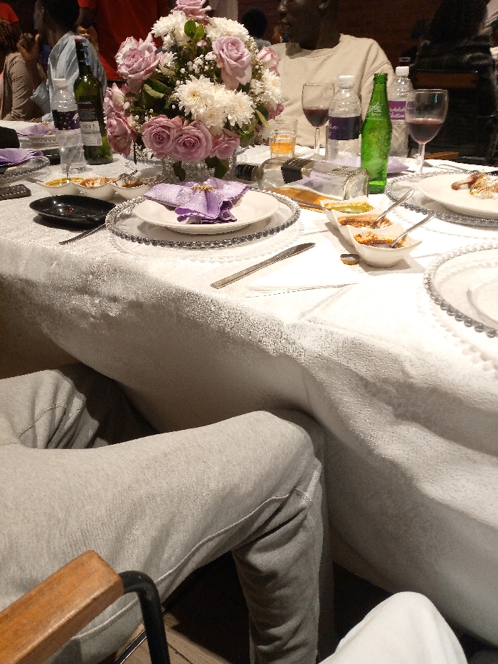 A formal dining table is set with a white tablecloth, plates adorned with silver beaded edges, and purple napkins. Floral arrangements with white and pink roses centerpiece the table. Beverages, including wine and bottled water, are also present. Partially visible in the foreground are the legs of individuals wearing grey sweatpants and white pants, positioned beneath the table.