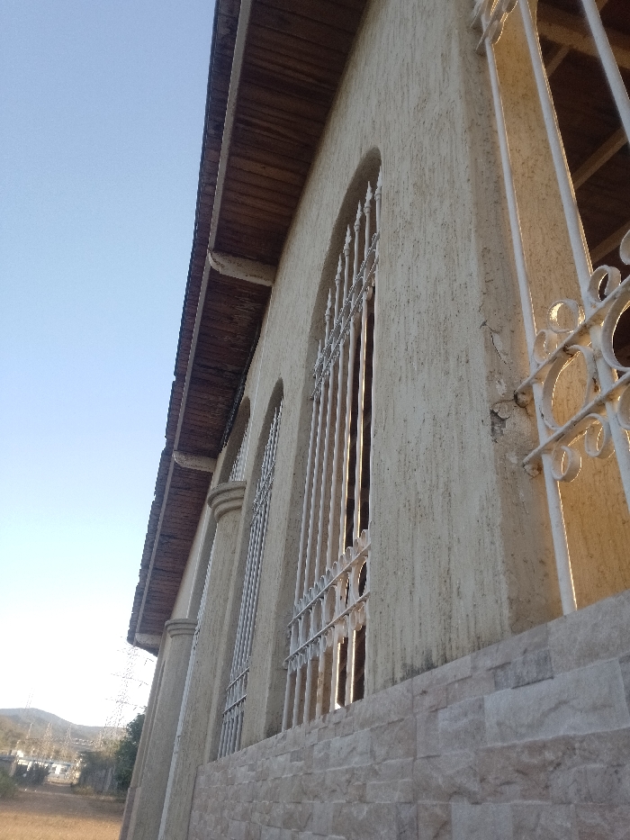 A low-angle view showcases a building's exterior. Arched windows, protected by white iron bars, punctuate the textured beige wall. The roof, comprised of dark wooden planks, extends overhead. A stone brick base grounds the structure. A clear sky forms the backdrop, with distant hills and power lines faintly visible on the left.