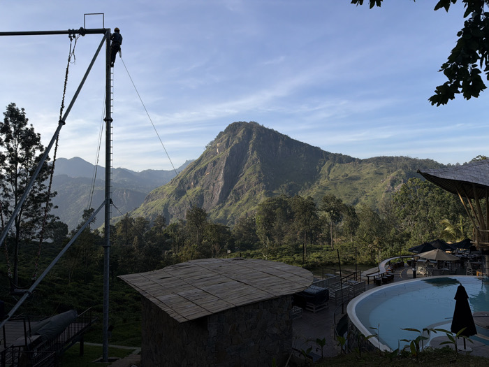 A scenic view captures a landscape with lush greenery and a prominent mountain. A metal structure, seemingly a zip line support, stands tall on the left, with a figure climbing it. Below, a small stone structure with a thatched roof is visible. To the right, a pool area with umbrellas and seating suggests a resort or recreational setting, blending the thrill of adventure with relaxed luxury.