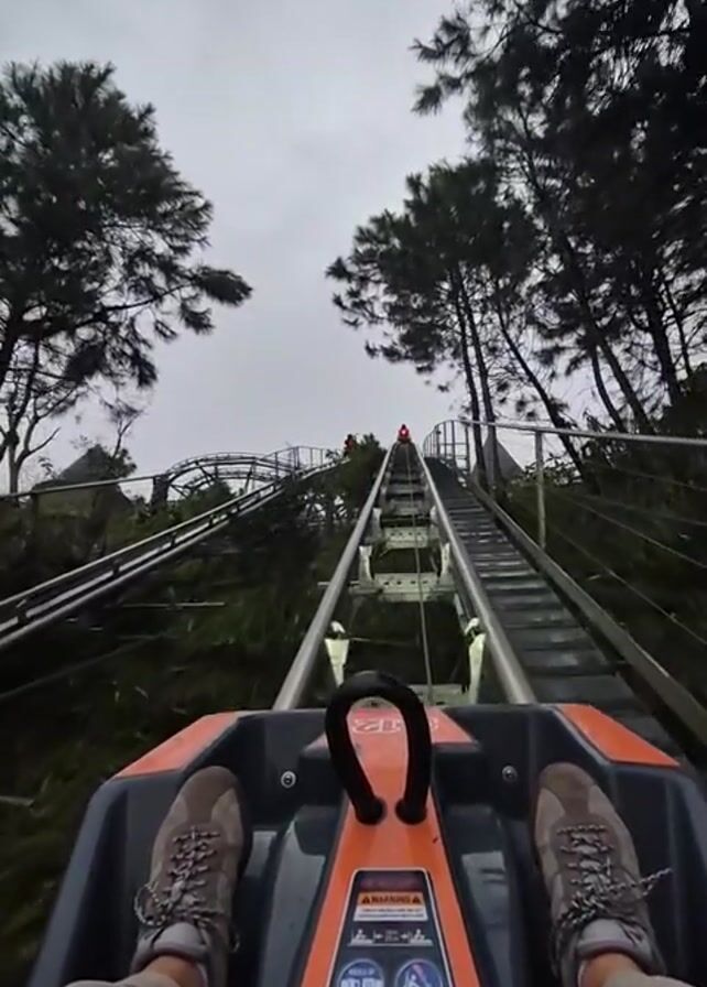 The first-person point-of-view shows a person riding an alpine coaster uphill on a track