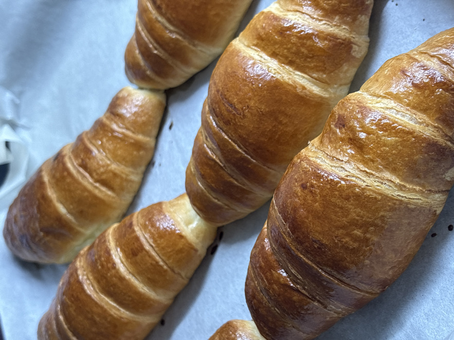 - "The image displays a close-up, elevated view of six freshly baked, golden-brown crescent-shaped pastries, resembling croissants or enriched dough rolls" by FM-c4VUG2, licensed under CC BY 4.0