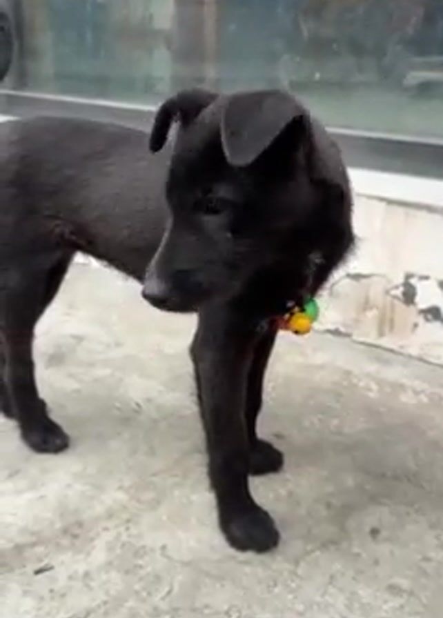 A short video shows a black dog standing and looking at the camera