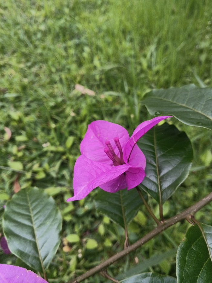 A vibrant pink bougainvillea flower is the focal point, showcasing its unique petal structure and prominent stamens. The flower is nestled amongst several large, glossy green leaves. A thin brown stem supports the flower and leaves. The background is a blurred expanse of green grass, adding depth and emphasizing the vibrant colors of the foreground elements. The lighting seems natural, contributing to the overall clarity of the image.