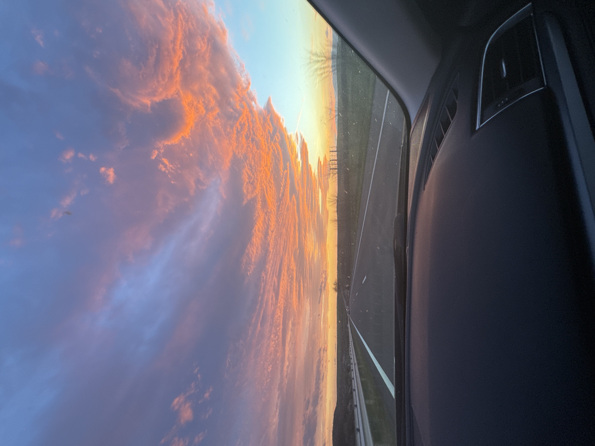 view from inside a car, looking out of the side window. A highway stretches into the distance, with power lines visible on the horizon. The sky is filled with vibrant orange and purple clouds, possibly during sunset or sunrise. The interior of the car is visible, including the dashboard and air vent. The image does not depict people, specific actions, or interactions, nor does it provide information about Zheleznik, Bulgaria, or the context of the image.