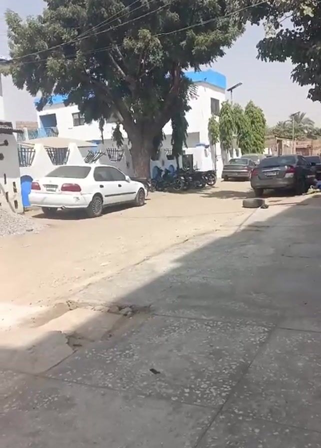 wide, paved walkway that extends into a dusty street with several parked vehicles. A large, dense tree is centrally positioned in the background, partially obscuring a white, two-story building with a blue roof. There are multiple motorcycles parked behind a white car near the tree. The day appears sunny.