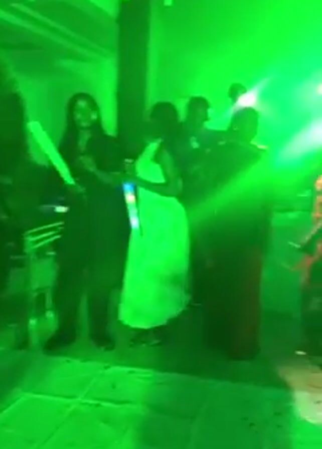 group of people dancing at a party. Some are holding light-up sticks. The lighting is mostly green, with some areas lit in white and blue. The group moves around the floor, the scene shifting quickly.