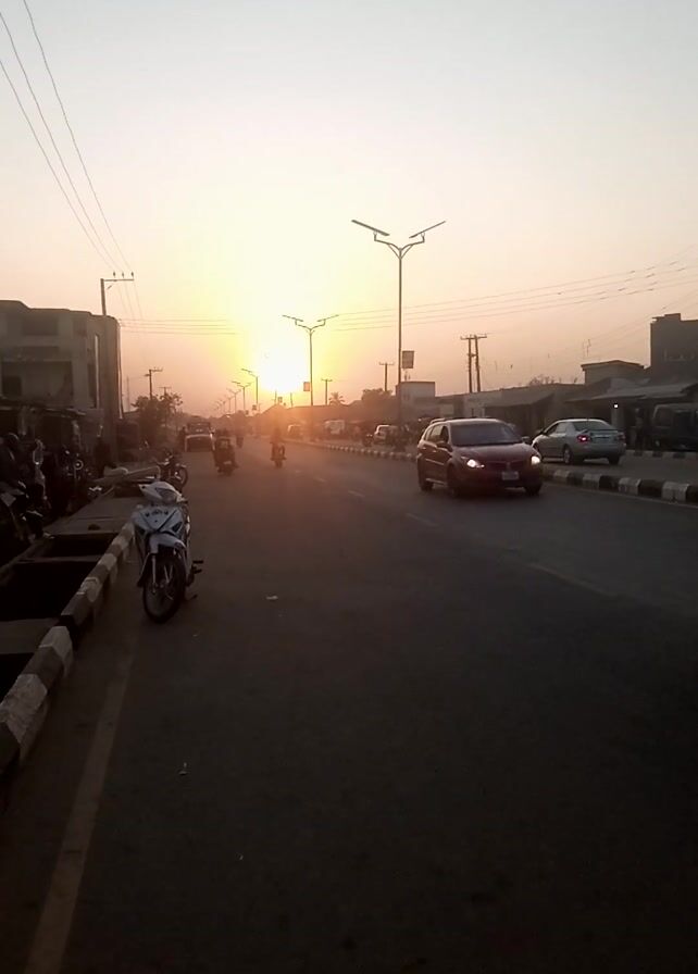 The scene shows a road with a bright sunset ahead. Various vehicles, including cars and motorcycles, travel along the road. Streetlights line the street, and buildings are visible on either side. A white motorcycle is parked on the side of the road in the foreground. Power lines crisscross overhead. The sky is pale.