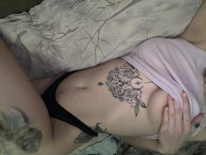 A person with tattoos on their torso and arm is lying in bed. They wear a light-colored shirt and dark underwear. A large floral tattoo adorns their chest and stomach. A smaller tattoo is located near the navel. Another tattoo is visible on the arm. The person is partially covered by bedding with a branch pattern. Their hand rests on their chest.