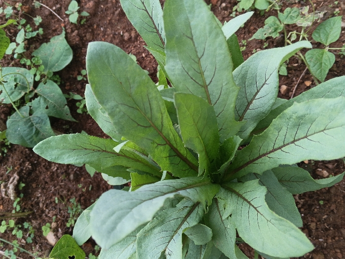 A close-up, overhead view depicts a vibrant green leafy plant anchored in reddish-brown soil, presumed to be located in the city of Ho Chi Minh City, Vietnam. The central subject plant displays numerous broad, dark green leaves radiating from a central point, each prominently marked with dark reddish-brown veins that branch across the leaf surface. The leaf edges appear slightly lobed or undulated. Surrounding the main plant, the soil is interspersed with smaller, lighter green plant growth, including some broad, irregularly shaped leaves from what appears to be a different species, possibly a low-growing or vining plant. No human presence, actions, or specific man-made objects are visible within the frame. The scene presents a natural, static agricultural or garden environment.