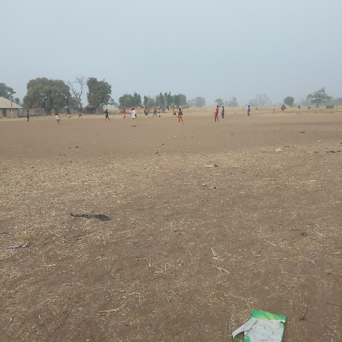 A group of people are playing a sport on a large, dry, and barren field. The field is mostly brown, with sparse patches of vegetation. In the background, there are trees and a building. The sky is overcast and hazy, casting a dull light over the scene. Debris is scattered across the foreground, adding to the desolate appearance.