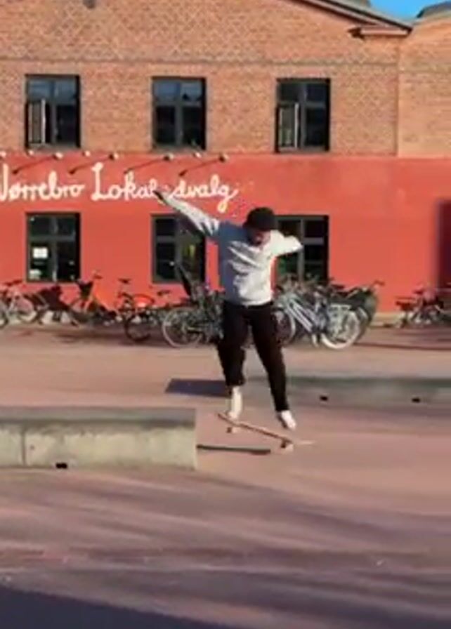 two people skateboarding in an outdoor urban setting. The first person, wearing a light-colored hoodie and dark pants, attempts a trick on a low concrete ledge but falls off the skateboard. Subsequently, a second person, wearing a dark hooded sweatshirt and dark pants, successfully performs a trick on the same ledge. The location features a brick building in the background with the words "Nørrebro Lokaludvalg" painted in white. Numerous bicycles are parked near the building. The ground is paved with red bricks and the sky is clear.