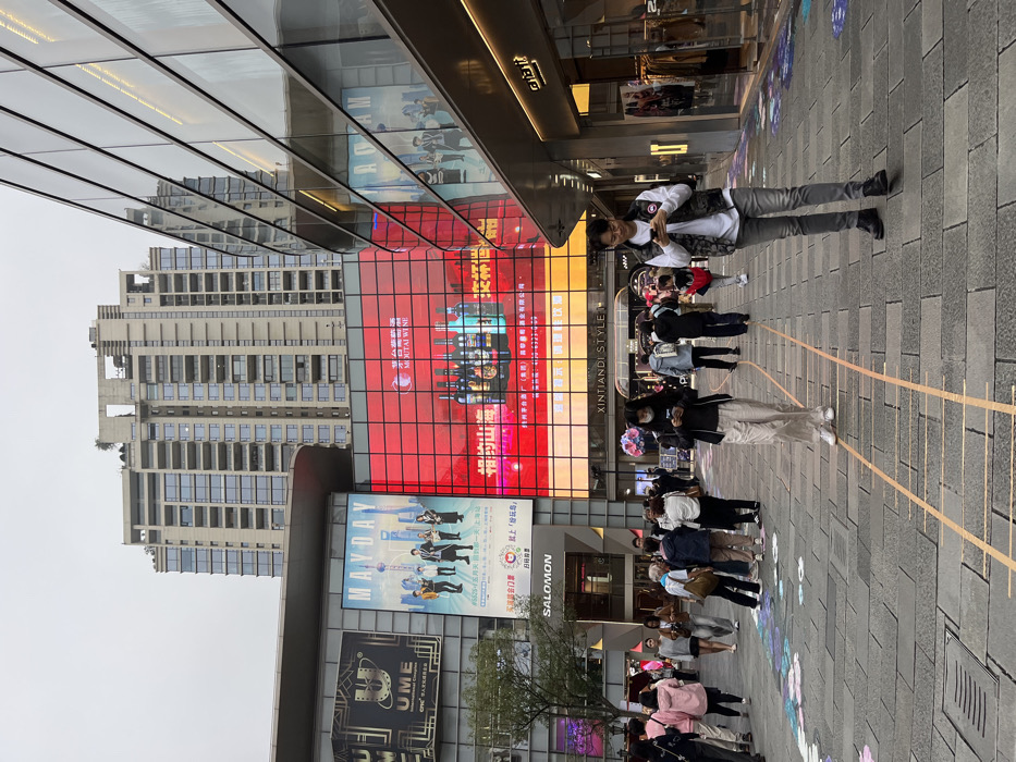 An urban scene shows a crowd of people walking along a paved street in front of modern buildings. The buildings feature large digital billboards advertising various brands, including MAYDAY, SALOMON, UME, and MOUTAI WINE. One billboard reads "XINTIANDI STYLE." Reflections of other buildings are visible in the glass surfaces of the structures. The sky is overcast, suggesting a cloudy day. A person is seen standing looking at their mobile device.
