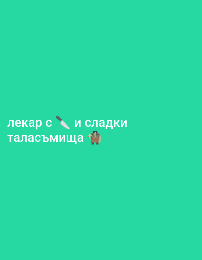 The image is a text graphic on a teal background. The text is in Bulgarian and reads "лекар с 🔪 и сладки таласъмища 👹". Translated, this means "doctor with 🔪 and sweet goblins 👹". The graphic features a knife emoji representing the knife, and a goblin emoji representing the goblins. The scene is not located in the city of Aytos, Bulgaria, but the text is written in Bulgarian, which is the official language of Bulgaria.