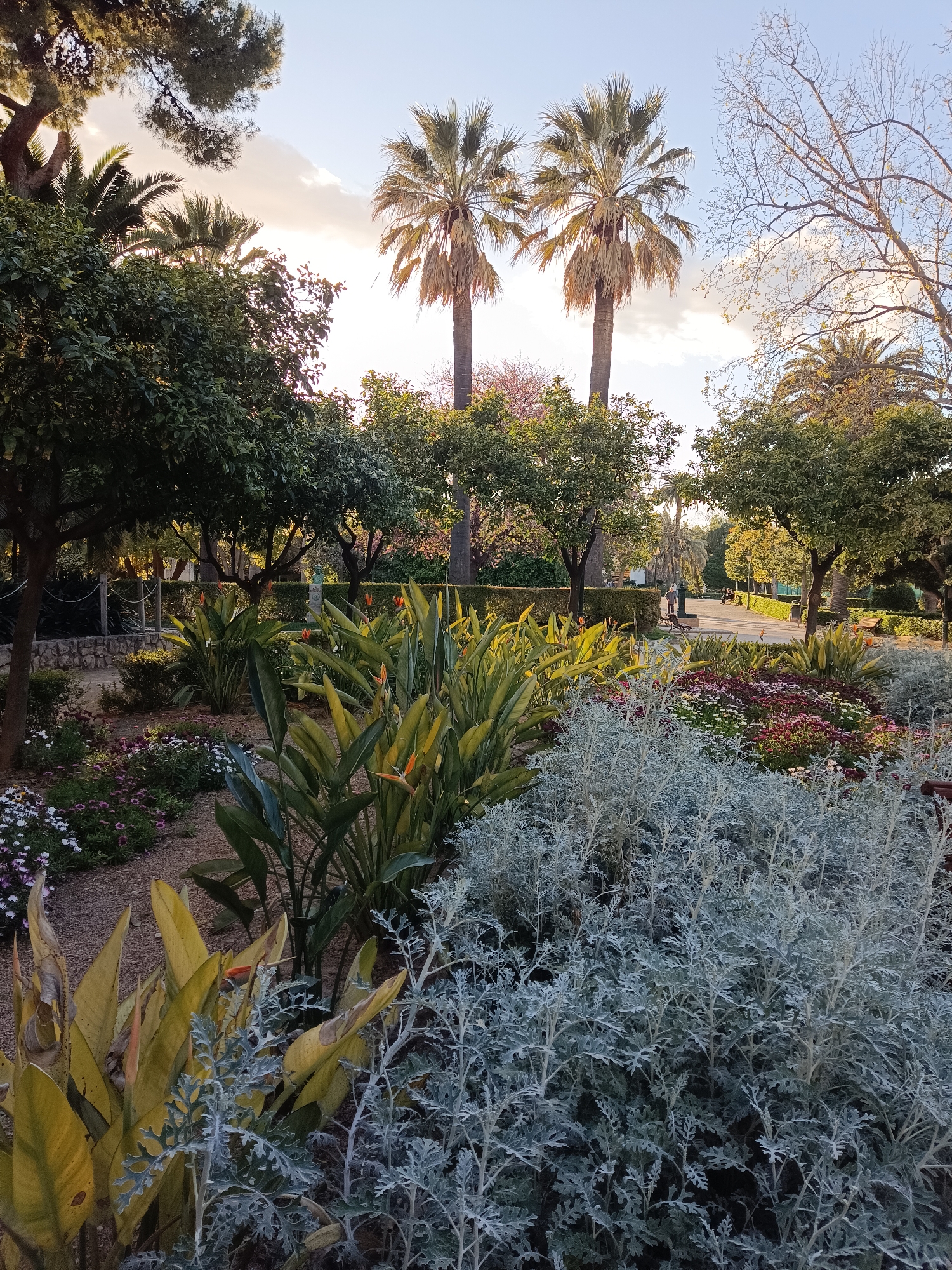 The image captures a scene within the Jardines del Real (Viveros) park in Valencia, Spain. A formal garden arrangement dominates the foreground, filled with a variety of plants, including silver-leaved species, flowering daisies, and Bird of Paradise plants. In the middle ground, meticulously maintained trees and hedges flank a pathway, creating a structured and orderly space. In the background, two tall palm trees stand prominently against a sky obscured by trees and clouds. The overall setting is a well-groomed park environment. Two people are walking in the background.