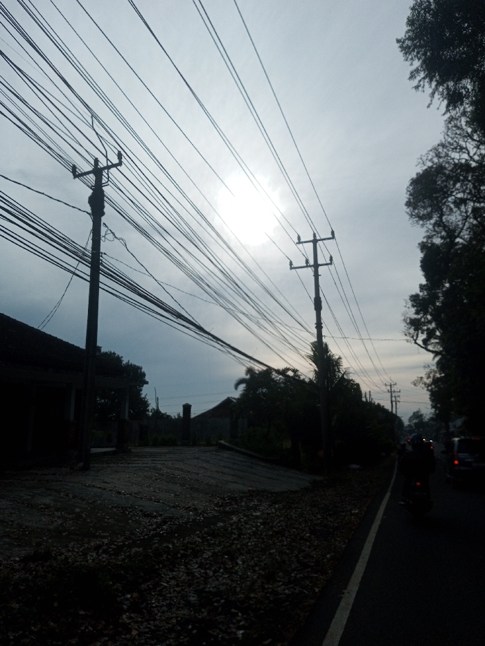 An outdoor scene in San Pya, Myanmar, depicts a street at either dawn or dusk, characterized by significant backlighting from a low, bright sun partially obscured by clouds in the upper-center sky. Numerous dark electrical and communication lines crisscross the upper two-thirds of the image, anchored to at least two prominent utility poles. One pole is situated on the left, supporting a dense cluster of wires, while a second, multi-branched utility pole stands in the mid-ground on the right. To the right, an asphalt road with a distinct white shoulder line recedes into the distance. A heavily silhouetted individual on a scooter or motorcycle travels away from the viewer on this road, while faint lights from other vehicles are visible further down the thoroughfare. The right side of the road is bordered by a dense line of tall, dark, silhouetted trees and vegetation. On the left side of the scene, an unpaved, uneven ground area, covered in dark debris or small stones, occupies the foreground. Behind this, a dark-roofed building with visible porch details is partially visible. Further back and to the left, another building or structural element with a distinct vertical feature, possibly a chimney or part of a gate, is present. Scattered dark foliage and palm trees are visible between the buildings and around the utility poles. No direct interactions between individuals are discernible.
