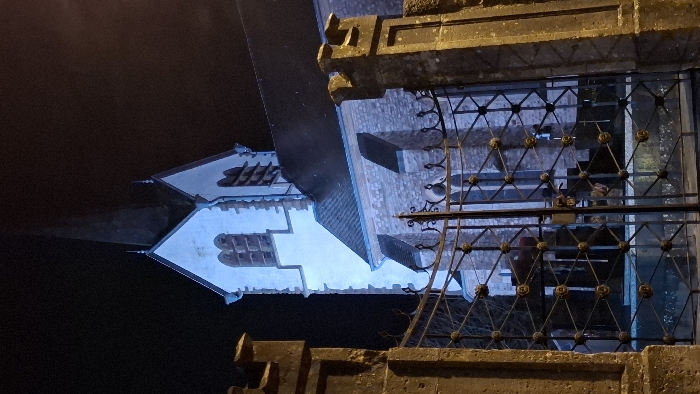 A building's steeple glows white at night, looming against a dark sky. The structure includes a section with rectangular windows. A decorative iron gate with geometric patterns and small round embellishments partially obscures the view. The gate is attached to a stone or concrete wall, positioned in the foreground. The wall's texture is rough, with visible imperfections and a dark, muted color.