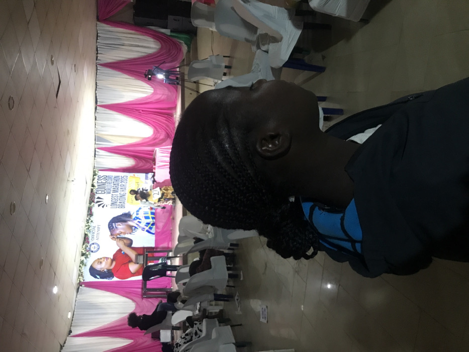 A person with braided hair is in focus. In the background, a stage decorated with pink drapes and a large banner about a "Guinness World Record" attempt for the "Longest Marathon Braiding Hair 2025" is visible. The banner displays images of people braiding hair. Chairs are arranged in rows, some occupied, indicating an audience or event setting. The lighting is moderate, and the perspective is slightly angled.