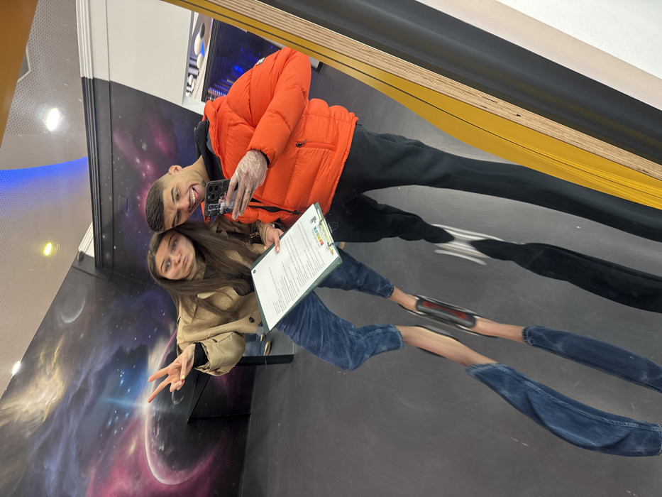 The image displays a mirror selfie featuring two individuals, a male and a female, situated within an exhibit at the Museum of Senses in Bucharest, Romania