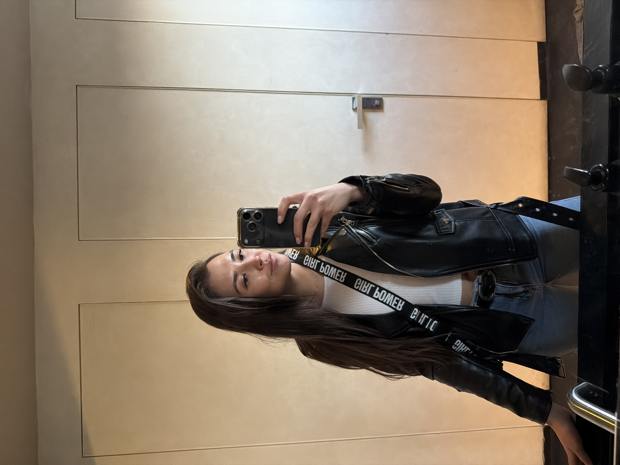 A woman is taking a selfie in front of a bathroom mirror. She has long brown hair and is wearing a black leather jacket, a white top, and blue jeans. She is holding a black smartphone in her right hand, presumably to take the picture. A strap is around her neck with the text "CIHT BOMEH" on it. The background features a beige door with minimalist design. The location cannot be verified as Moscow, Russia.