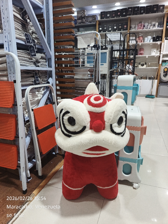 The image captures the interior of a retail store in Maracaibo, Venezuela, with a timestamp of February 26, 2026, at 15:54. The central focus is a large, plush, red and white Chinese lion dance figure, standing upright in the immediate foreground. To the left, a light-colored metal shelving unit is stocked with numerous folded, light-colored textiles, likely towels or blankets, some with black tags attached. In front of this shelving unit, a white metal step stool with three bright orange, ridged steps is partially visible. The background reveals a store environment with multiple display fixtures. In the midground, various modular plastic storage units, predominantly white with blue and pink accents, are stacked. Further back, a person wearing a light-colored shirt is partially visible behind metal display racks, appearing to attend to merchandise. Extensive white shelving units in the background hold an array of household items, kitchenware, and packaged products. A green broom leans against a shelf on the far right. The floor consists of light-colored tiles, and the store is illuminated by ceiling-mounted lights. A wooden slat divider is also visible in the background.
