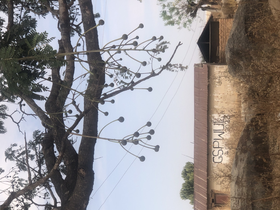 The image captures an outdoor scene in Mangu Halle, Nigeria, under daylight conditions. A large, mature tree occupies the upper half of the frame, its dark, gnarled branches extending broadly. Numerous pendulous stems hang from the branches, each terminating in a dark, spherical fruit or pod. Smaller clusters of green foliage are also visible on the tree. Utility lines are visible traversing the pale blue sky horizontally, positioned behind some of the tree's hanging elements. In the midground, a single-story building with light-colored, possibly stucco or plaster, walls and a reddish-brown corrugated metal roof is prominent. The white block letters "G.S.P.W.U.L." are spray-painted on its facade, with a partially visible date "2023" below. A simple wooden door is located on the left side of this building. To its right, a smaller, open-front structure made of stacked mud bricks with a dark, sloped roof is visible. The ground in the foreground is covered with dry, sparse, light brown vegetation and several large, irregular grey rocks. No individuals are present, and no actions or interactions are depicted.