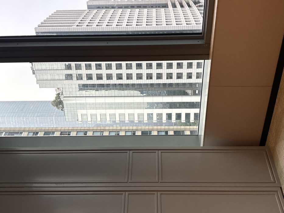 The image captures an indoor perspective looking out a window at an urban high-rise landscape in Tianhe District, China