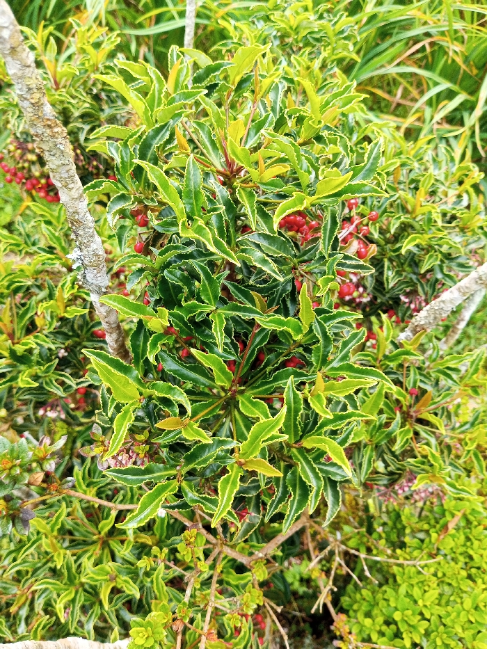 A vibrant, dense shrub with dark green leaves edged in yellow dominates the frame. Clusters of small, bright red berries are scattered throughout the foliage. A textured, light gray branch intersects the shrub from the left, adding a natural element. Other plants are visible in the background, adding depth to the shot. The lighting is soft, highlighting the textures and vibrant colors.