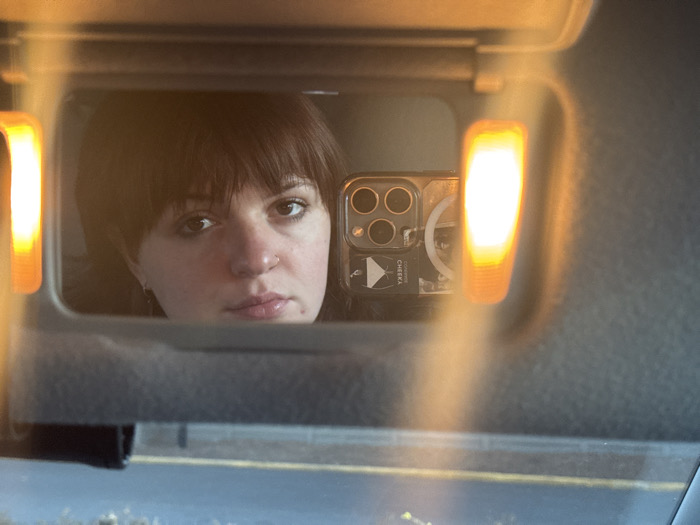 A woman is reflected in a car's vanity mirror. She has dark hair with bangs, light skin, and a nose piercing. She is holding a phone, its camera lenses visible, with a patterned case. The vanity mirror lights on either side are illuminated, casting a warm glow. A highway or street is visible in the background through the windshield.