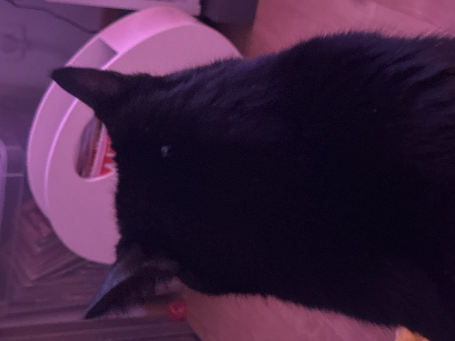 A black cat's head dominates the frame, angled from the upper right to the lower left. One ear is sharply visible. A white, ring-shaped object sits to the cat's left, illuminated with a pinkish hue. Various items, including what appear to be card containers, are stacked beneath the ring. The lighting is subdued, contributing to the overall dark tone of the image.
