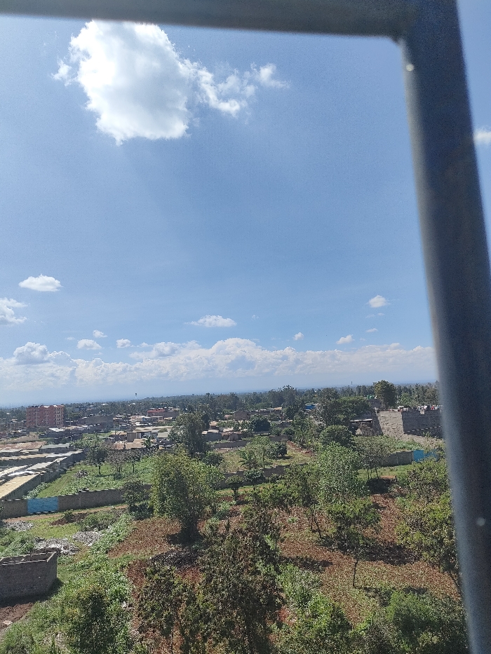 This is an elevated view depicting Juja ward, Kenya, under a clear blue sky with scattered white cumulus clouds