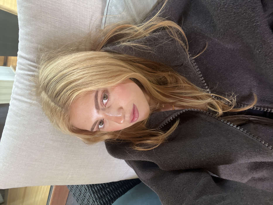 A woman reclines on a light-colored cushion wearing a dark zip-up hoodie. Her blonde hair is styled in loose waves. She has fair skin, light brown eyes, and pink lips. A delicate gold necklace is visible. The background is blurred, suggesting an indoor setting with muted tones. The image is taken from a slightly elevated angle, focusing on her face and upper torso.