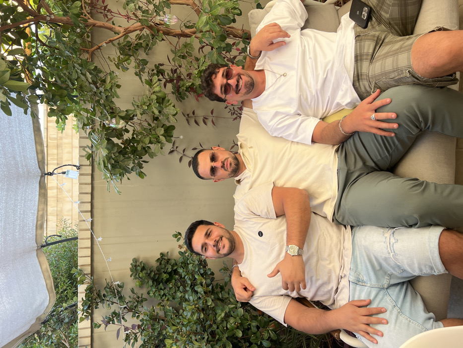 - "This image depicts three adult males seated side-by-side on a light-colored outdoor sofa within a shaded patio or backyard setting, located in Petah Tikva, Israel" by FM-0vSl53, licensed under CC BY 4.0